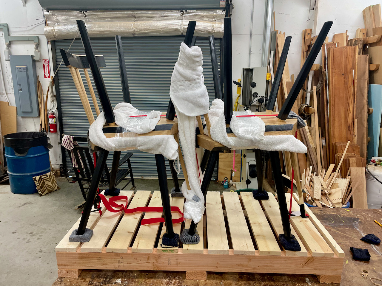 Another function of the chair would to be conveniently portable. In this case, the chair is easily moved with one hand over a short distance, thanks to the hourglass like shape of the legs. It also has the added feature of being quickly disassembled and packed in a bag for travel.