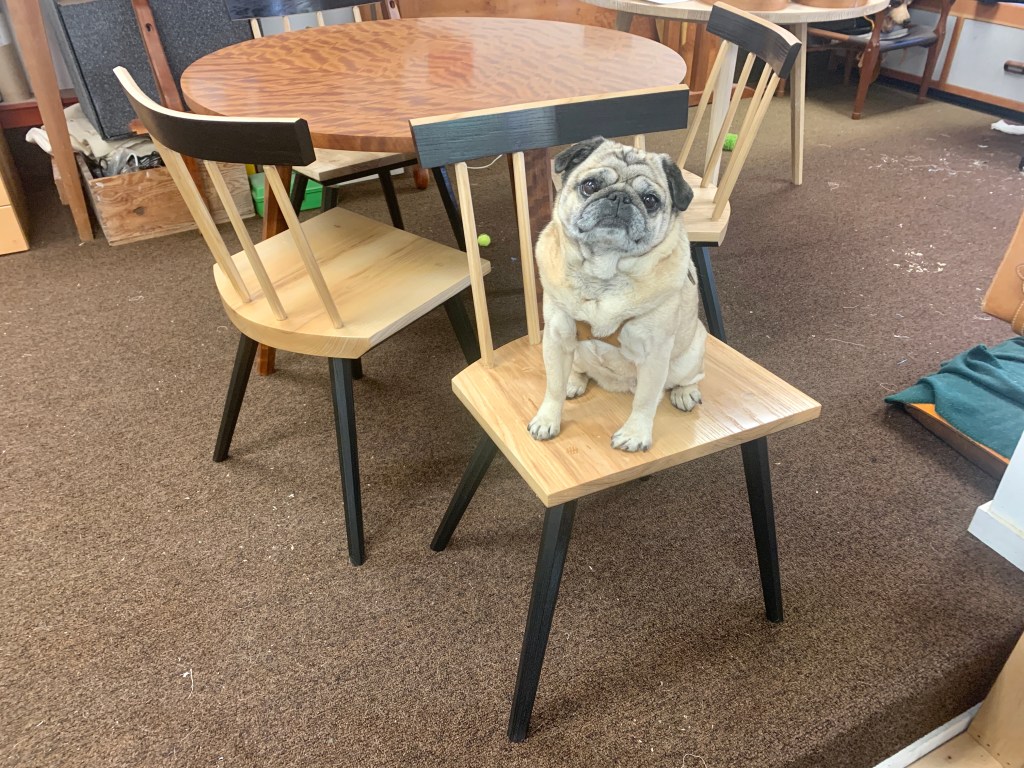 These Staked Leg Dining Chairs were built to accompany either the Makore Staked Leg Table, or the White Oak Staked Leg Table. The wood is ash. The finish is black milk paint, shellack, and polyurethane. They are comfortable, light and sturdy and should last generations.
